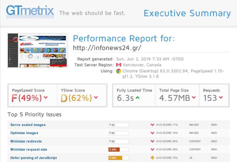 Η ιστοσελίδα που μας ανατέθηκε να υλοποιήσουμε / αναβαθμίσουμε είναι το ειδησεογραφικό site infonews24.gr. Η πρώτη εικόνα που αντικρίσαμε ήταν ένα “λειτουργικό” μεν site άλλα είχε περάσει η πάροδος του χρόνου και χρειαζόταν επειγόντως αναβάθμιση και optimization / βελτιστοποίηση όπως δείχνουν και οι μετρήσεις που πραγματοποιήσαμε στην πλατφόρμα GTmetrix.